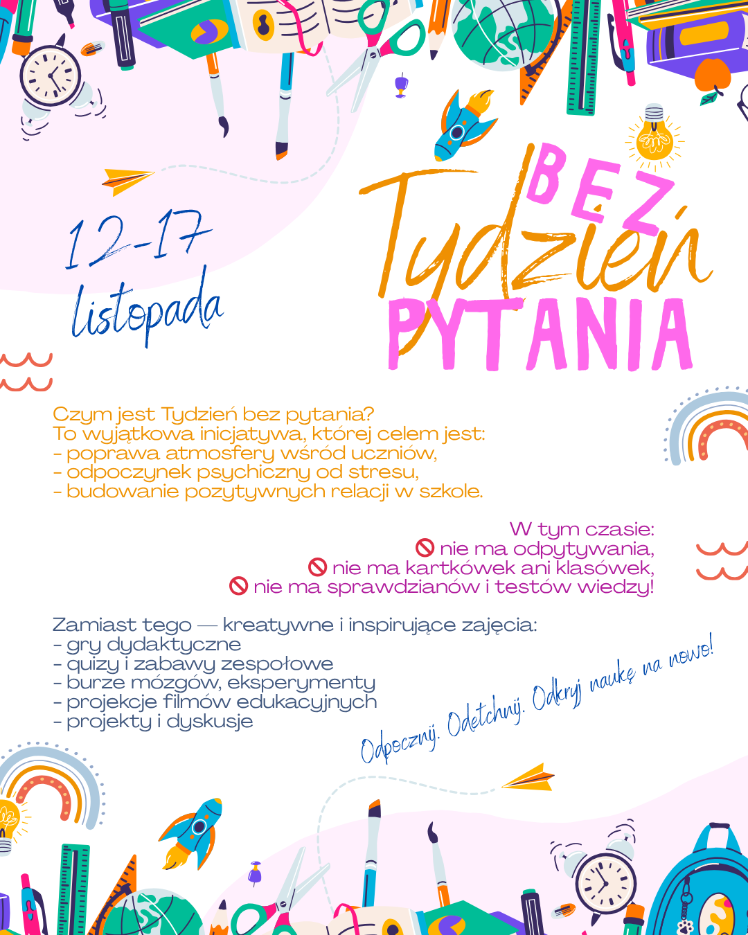 Od 12 listopada rozpoczynamy akcję „Tydzień bez pytania”, ogłoszoną dziś przez dyrektora szkoły pana Kazimierza Rojewskiego, zainicjowaną przez Samorząd Uczniowski we współpracy z panią Iwoną Żelazek, Justyną Katolik oraz panem Łukaszem Jasińskim. To czas na oddech od szkolnych stresów i naukę w kreatywny, przyjazny sposób!