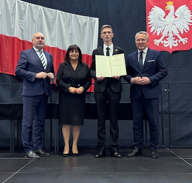 Na uroczystości pamiątkowe dyplomy wręczali Kujawsko-Pomorski Wicewojewoda Pan Piotr Hemmerling wraz z Kujawsko-Pomorskim Kuratorem Oświaty Panią Grażyną Dziedzic. Udział w uroczystej gali wraz z nagrodzonym uczniem wziął Dyrektor ZSCKR w Starym Brześciu Pan Kazimierz Rojewski