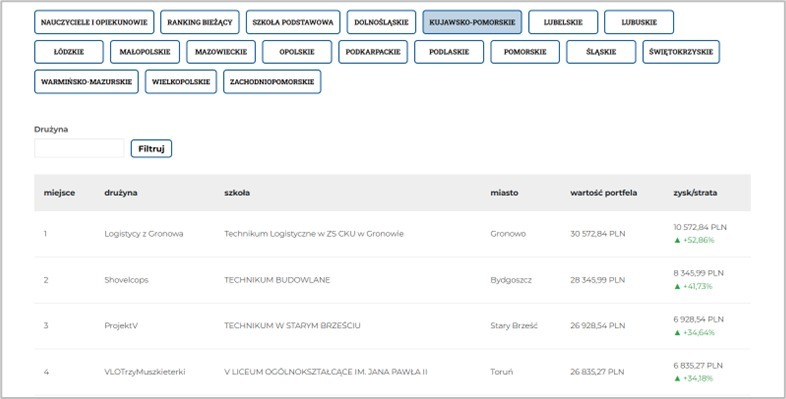 W tym roku szkolnym uczniowie klas pierwszych zdobywają doświadczenie w Szkolnej Internetowej Grze Giełdowej. I etap inwestowania w akcje firm notowanych na Giełdzie Papierów Wartościowych w Warszawie zespół ProjektV zakończył na 3. miejscu w województwie kujawsko-pomorskim i 52. w rankingu ogólnopolskim. „Uważam to za wielki sukces, jak na pierwszy kontakt z giełdą. Nie sądziłam, że takie wysokie lokaty uzyskamy. Moje emocje zmieniały się wraz z podejmowanymi decyzjami kupna i sprzedaży – od ekscytacji do frustracji. Nie jest to tak łatwe, jak się wydawało. Spadające notowania powodowały utratę pieniędzy, dlatego też każda kolejna inwestycja była już bardziej przemyślana, a stan wirtualnego portfela motywował do walki i zdobywania wiedzy o funkcjonowaniu rynku papierów wartościowych.” – mówi liderka zespołu ProjektV Wiktoria Biesiada. Aktualnie trwa II etap SIGG – zespoły inwestują 10 000 zł w kontrakty terminowe na GPW. Finał konkursu zaplanowany jest na 23 kwietnia 2026 roku w Warszawie.