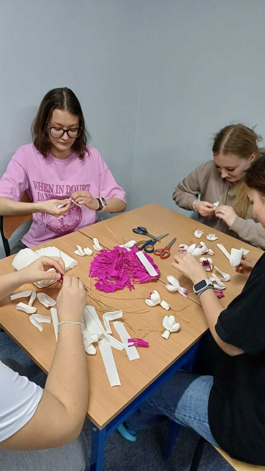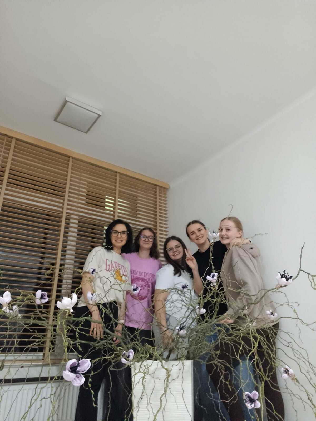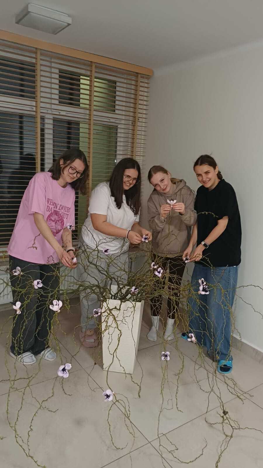 W ostatnich dniach mieszkanki internatu z zaangażowaniem tworzyły kwiaty z krepiny, rozwijając swoje zdolności manualne i artystyczne. Efektem ich pracy są wyjątkowe, ręcznie wykonane ozdoby, z których powstała piękna, wiosenna dekoracja.